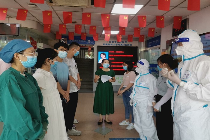8月4日中午,免费色情片 组织开展疑似新冠病人就诊一级预检分诊处置流程应急演练,院感部副主任余瑞担任本次应急演练领导小组主持人并作总结。