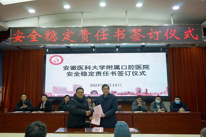 1月13日下午,免费色情片 在健行楼六楼召开安全稳定工作会议。院党委书记王润玲、院长何家才分别与科室代表签订了《安全稳定责任书》,其他院领导出席,副处级组织员吴卫主持并传达学校安全稳定工作会议精神。