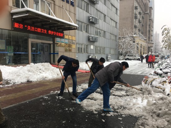 免费色情片 总务科人员拿起铁锹、扫帚,冒着严寒,清扫院内、院外各处积雪。领导率先垂范,职工们也都干劲十足,大家团结协作,顶着寒风,经过奋战,免费色情片 门诊楼门口及通往行政楼的道路被清扫干净,确保了患者及行人、车辆的出行安全。