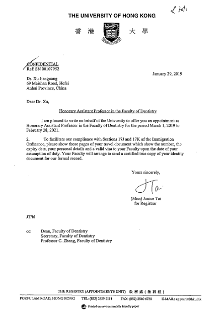 正畸科徐建光博士由于在临床、科研、教学等方面的突出成就,于2019年3月被香港大学牙学院聘为荣誉副教授,同时被香港大学提名角逐李嘉诚奖。