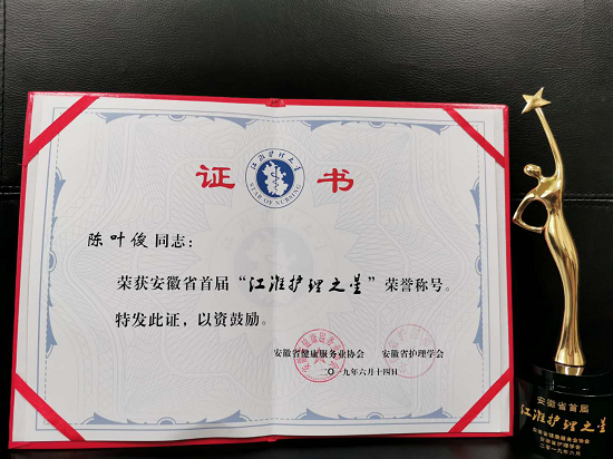 护理部主任陈叶俊凭借雄厚的实力和良好的口碑,通过单位推荐、网络投票和专家评议程序,最终脱颖而出,被授予安徽省首届“江淮护理之星”称号。