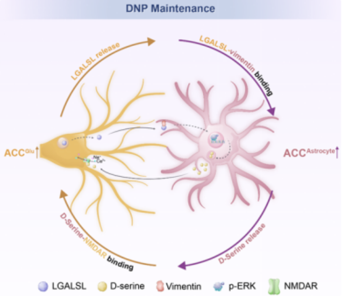 该项研究发现一种名为LGALSL的半乳糖凝集素相关蛋白在DNP模型大鼠脑脊液和前扣带回皮层(ACC)中积累,并增强疼痛敏感性。进一步机制研究表明,LGALSL能与ACC星形胶质细胞特异性表达的波形蛋白(vimentin)结合,从而激活星形胶质细胞。激活后的星形胶质细胞释放胶质递质D-丝氨酸,进而刺激ACC谷氨酸能神经元,诱发中枢敏化,在DNP的维持中发挥关键作用。基于上述关键分子互作机制,研究团队设计并合成了一种能够阻断LGALSL与波形蛋白结合的人工肽。实验证实,该人工肽可有效缓解DNP相关症状,为未来开发靶向治疗药物奠定了重要基础。