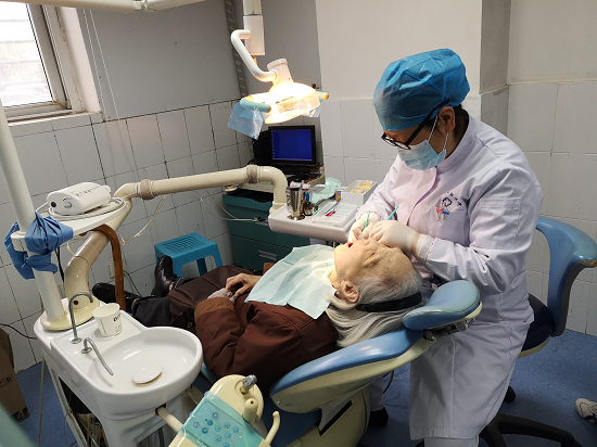 诊室内,综合科李倩医生在做自身准备,老奶奶安稳的躺在牙椅上准备接受最后一次复诊。经过多次治疗,高奶奶的病情已经恢复了许多,慈祥的笑容又出现在她的脸上。回想高奶奶第一次就诊时一脸的无助,因为自己收入很低,子女都不在身边,牙齿坏了不能吃东西也不知如何是好。在了解情况后,李医生主动为她减免了费用,并安抚老人,大家像家人一样关心她,最终使她放心接受治疗。带上义齿的高奶奶很高兴,临走时开心的感谢大家,满意而归。